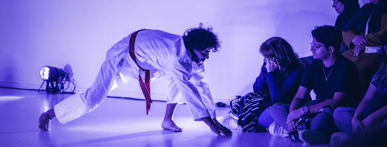 Mohammed Al Qudwa est artiste, poète, champion de karaté et étudiant ingénieur. À 22 ans, il a déjà vécu cinq guerres à Gaza. La première fois, il avait 5 ans. 3 saisons et 1 corps, sa première pièce, raconte une enfance qui connait déjà le bruit des bombes, et un parcours de jeune adulte forcé de tout laisser derrière lui. Seul en scène, il fait résonner les voix d’autres qui, comme lui, ont connu l’enfer du couloir « humanitaire » d’évacuation forcée en novembre 2023. Mêlant théâtre, danse et karaté, il met les mots sur l’indicible, et raconte la manière dont l’horreur de la guerre l’a changé – lui, et beaucoup d’autres. Un récit en « monodrame » de la destruction d’un territoire et de son histoire, qui interroge la possibilité d’espoir pour l’avenir.