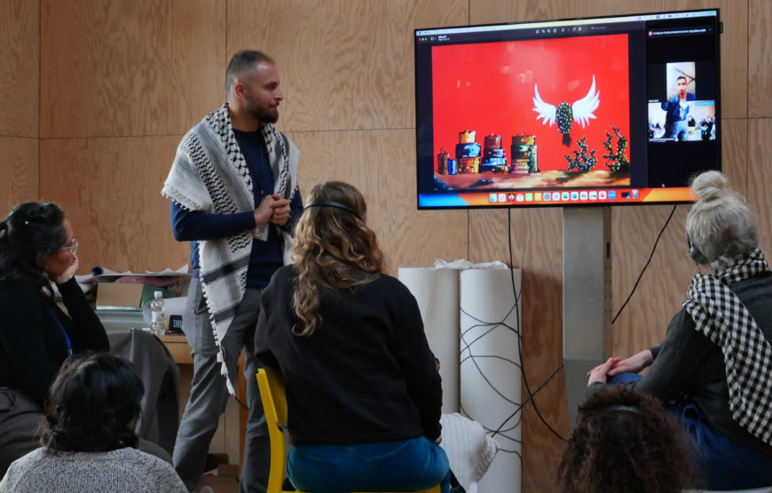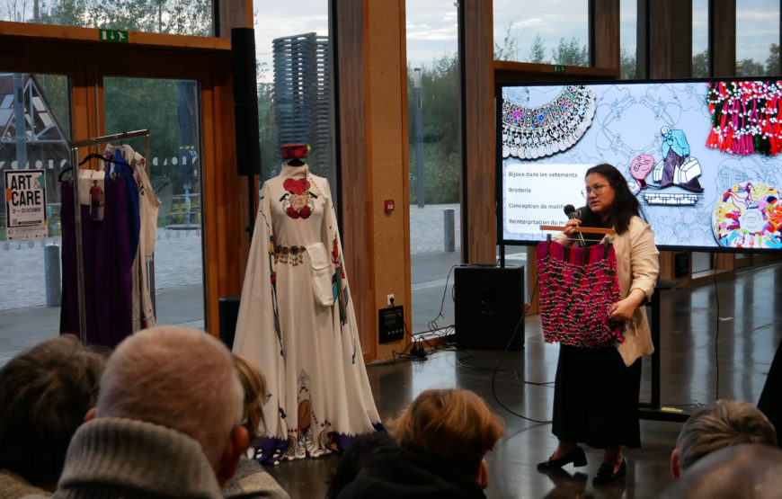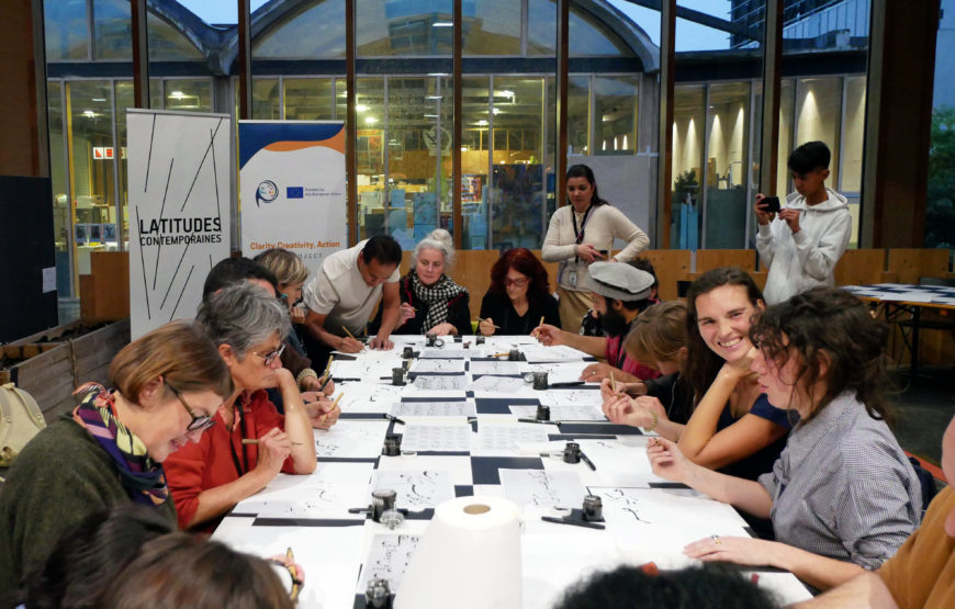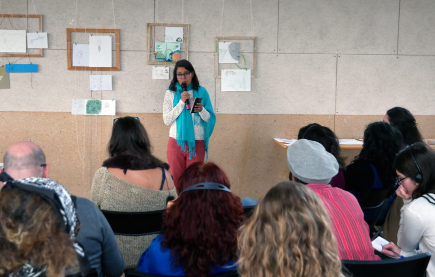 Le 21 octobre, elle a proposé aux participant·es une présentation de plusieurs œuvres de sa série Convergences, ainsi que des productions-traces de l’atelier « le dessin nomade » réalisés pendant et après une recherche-action-création sur les notions d’accueil et hospitalité, repensées à travers la pratique artistique partagée avec des personnes migrantes.