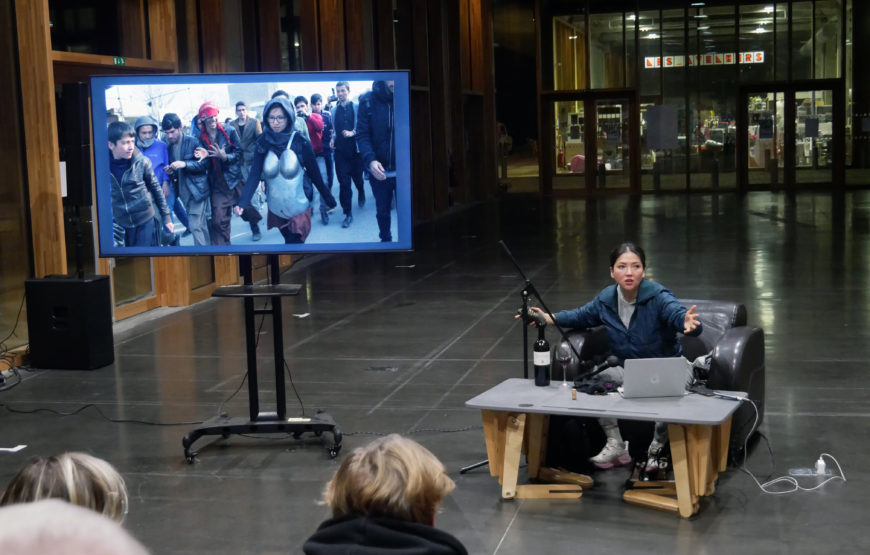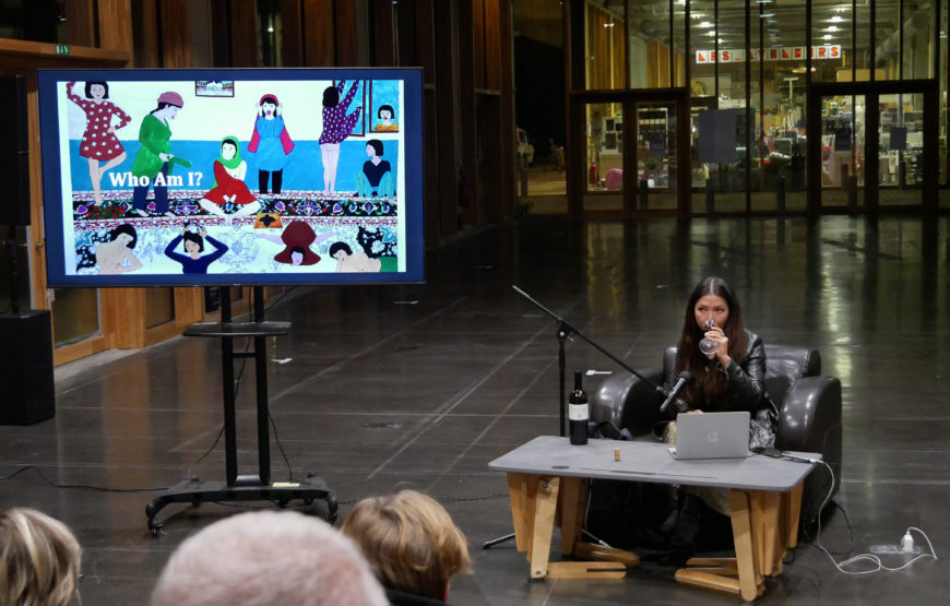 I Will Greet the Sun Again est une conférence performative, dans laquelle l’artiste féministe Hazara Kubra Khademi présente sa vie et ses œuvres, tout en brouillant les limites entre ce que nous appelons l’intimité et ce qui peut être dit en public. Elle passe en revue un certain nombre de ses dessins, chacun d’entre eux posant différents récits de la représentation féminine, et expose en même temps ses propres récits, liés à son histoire très personnelle.